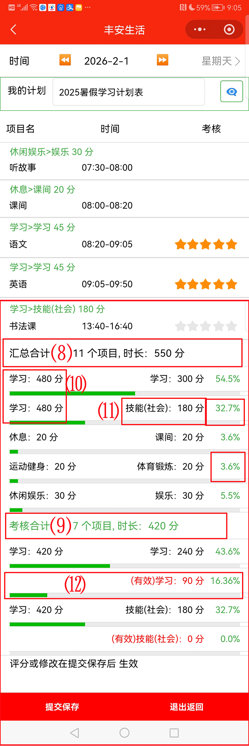 ⑻该计划当天有11个项目 合计时间 550分钟